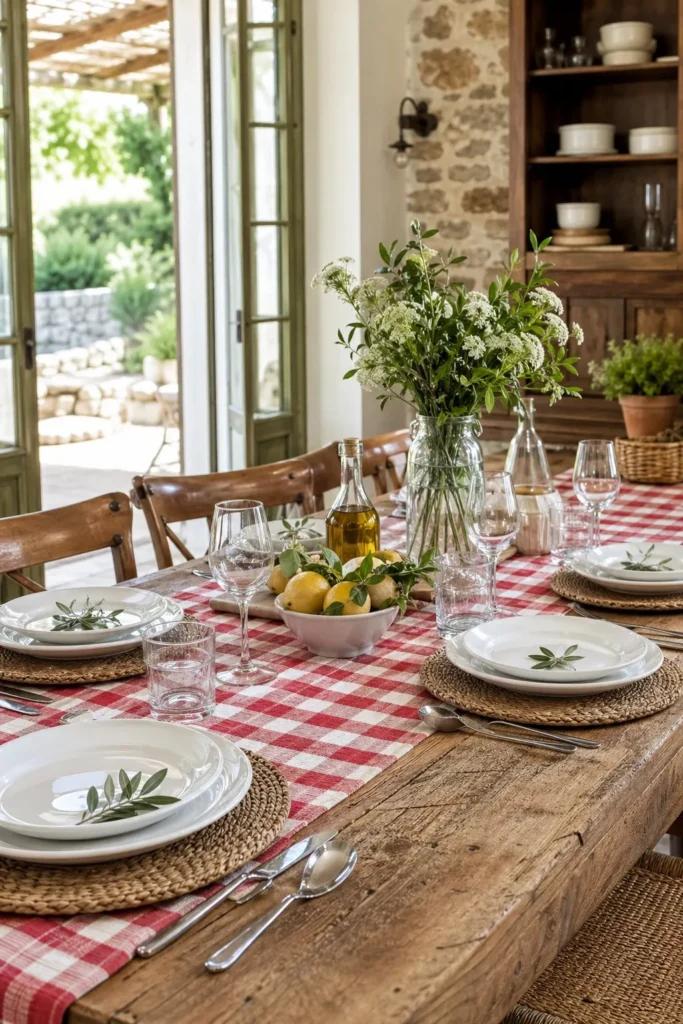 A classic red and white check pattern screams summer picnics and backyard barbecues. Lay a long gingham runner down the center of your exposed, scraped-wood dining table. Pair it with woven water hyacinth chargers and basic white ceramic plates. The casual cotton fabric is easy to wash, making it highly practical for messy summer meals with the family.