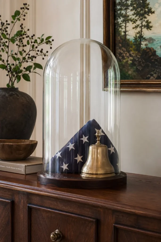 Glass cloches add an instant sense of importance to whatever you place inside them. Fold a heavily worn, antique 48-star flag into a tight triangle and set it on a wooden base under the glass. Tuck a small tarnished brass bell or an old black-and-white family photo next to it. This museum-like display protects fragile vintage pieces while making them a prominent conversation starter.