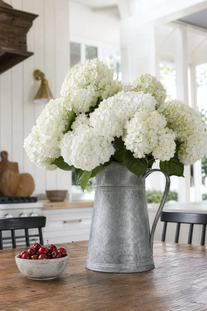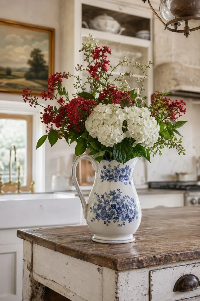 Sometimes the best seasonal decor does not involve a flag at all. A massive bunch of fluffy white hydrangeas in a heavy iron or enamelware pitcher anchors the room beautifully. Place a small white ceramic bowl filled with bright red, freshly washed cherries right beside it. You achieve the holiday color scheme entirely through natural, edible, and botanical elements.