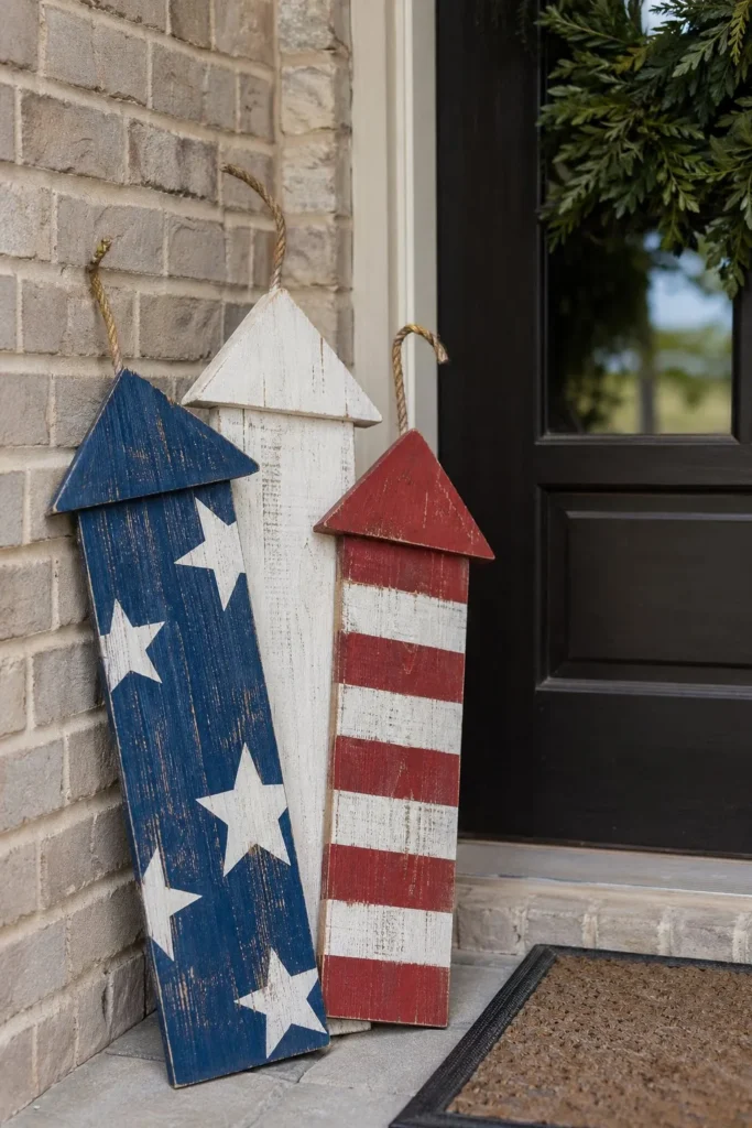 Cut thick pieces of 4×4 lumber to different lengths to build your own rustic firecracker display. Paint them in flat, muted Americana colors, sand the corners down to the raw wood, and use thick rope for the fuses. Stand them up together near your front entryway alongside your welcome mat. They add a chunky, handmade element that survives harsh summer sun and wind without fading.