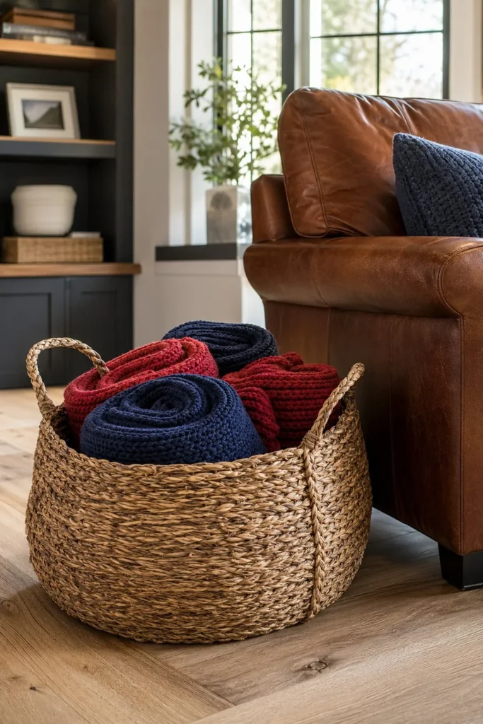 19. Incorporate Woven Baskets to Hold Red and Blue Throw Blankets