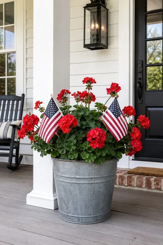 Galvanized metal naturally belongs outdoors, making it a staple for patriotic porch ideas. Grab a few weathered buckets and fill them with potting soil and bright red geraniums. Stick a few small wooden-dowel flags right into the dirt for an effortless summer porch display. The dull gray of the zinc balances the bright reds, ensuring your patriotic front porch decor stays grounded and casual.