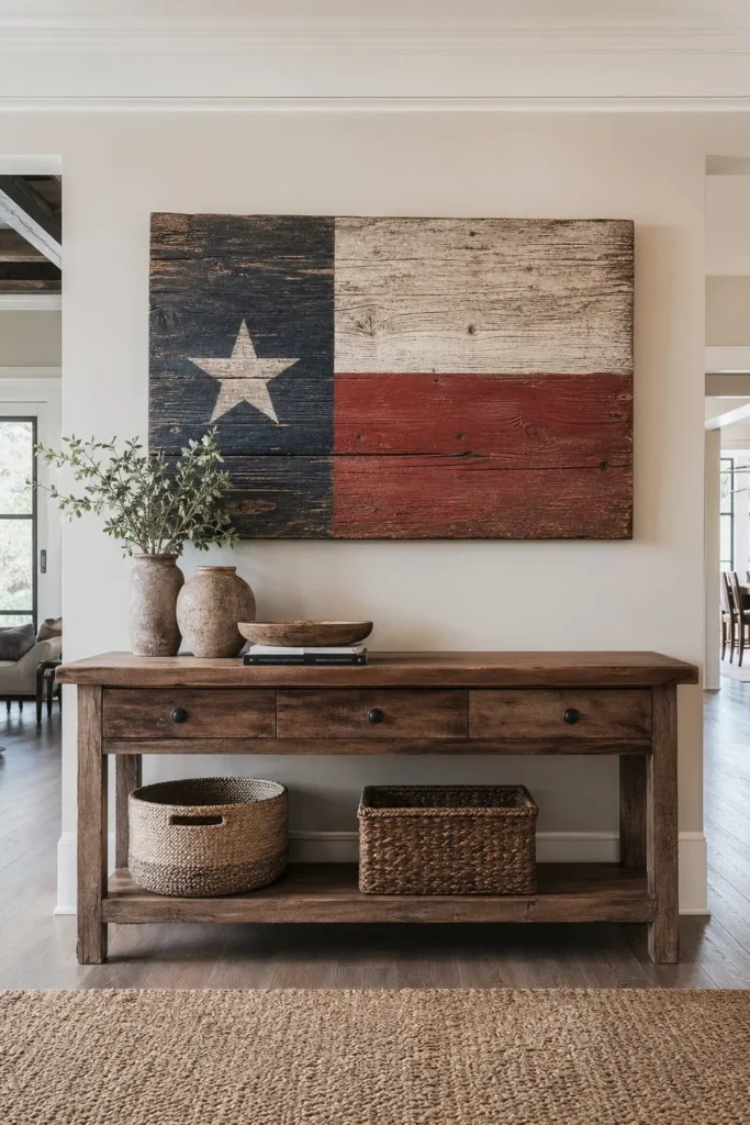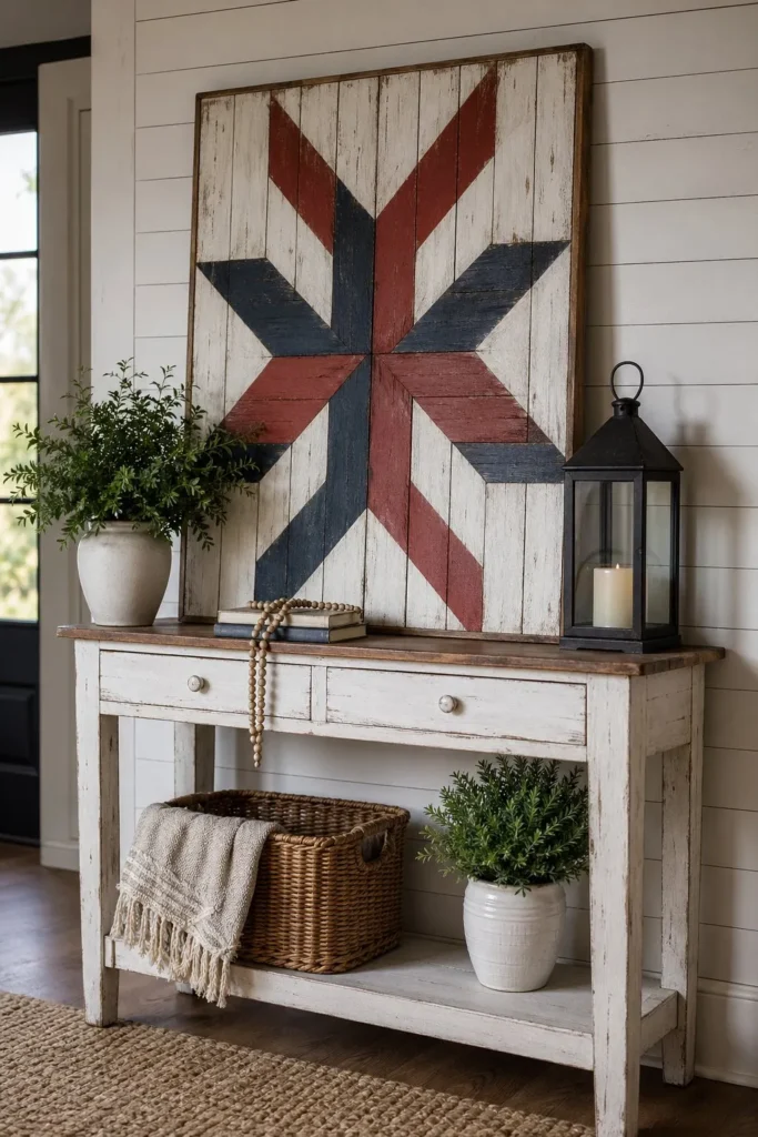 A chunky wooden sign instantly grounds an entryway display. Look for a heavy, distressed board featuring a single large barn star painted in faded navy blue. Lean it casually against the wall behind a stack of old books or a small potted plant. It welcomes guests with that classic farmhouse 4th of july decor feeling right as they walk through the front door.