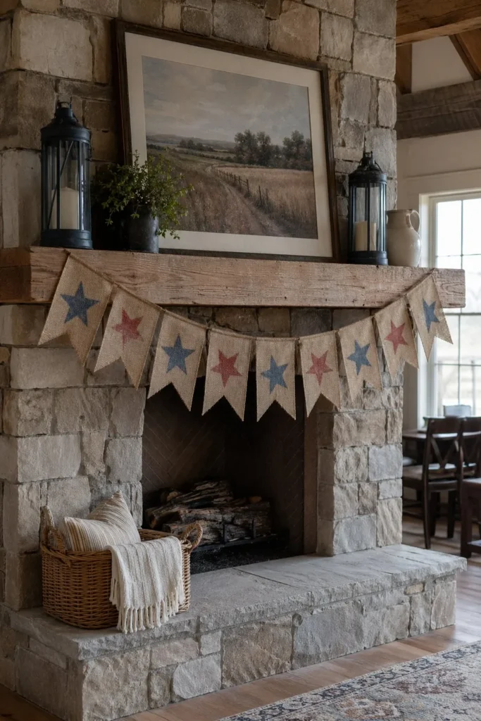 - 4. Hang a Burlap Patriotic Banner Across the Fireplace Mantel
