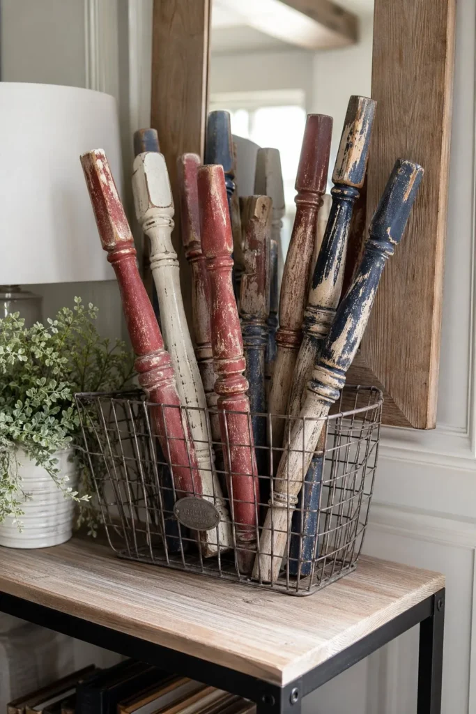 Salvaged architectural pieces are a goldmine for farmhouse styling. Find some old stair balusters or chair spindles and dry-brush them with chalk paint in navy, cream, and barn red. Group them standing upright inside a rusted wire basket or a tall olive bucket. This provides height to a console table vignette while showing off peeling paint and raw wood grain.