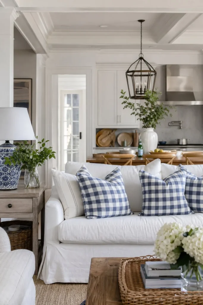 - 8. Mix Navy Blue Gingham Pillows on a White Slipcovered Sofa
