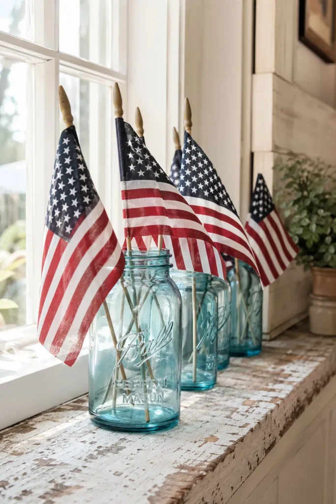 Genuine vintage mason jars have a slight aqua-blue tint to the glass that catches the summer sunlight perfectly. Group three jars of varying heights on your kitchen windowsill or dining table. Drop a handful of small, wooden-stick American flags into the jars. It is a five-minute styling trick that creates authentic vintage patriotic decor using items you likely already own.