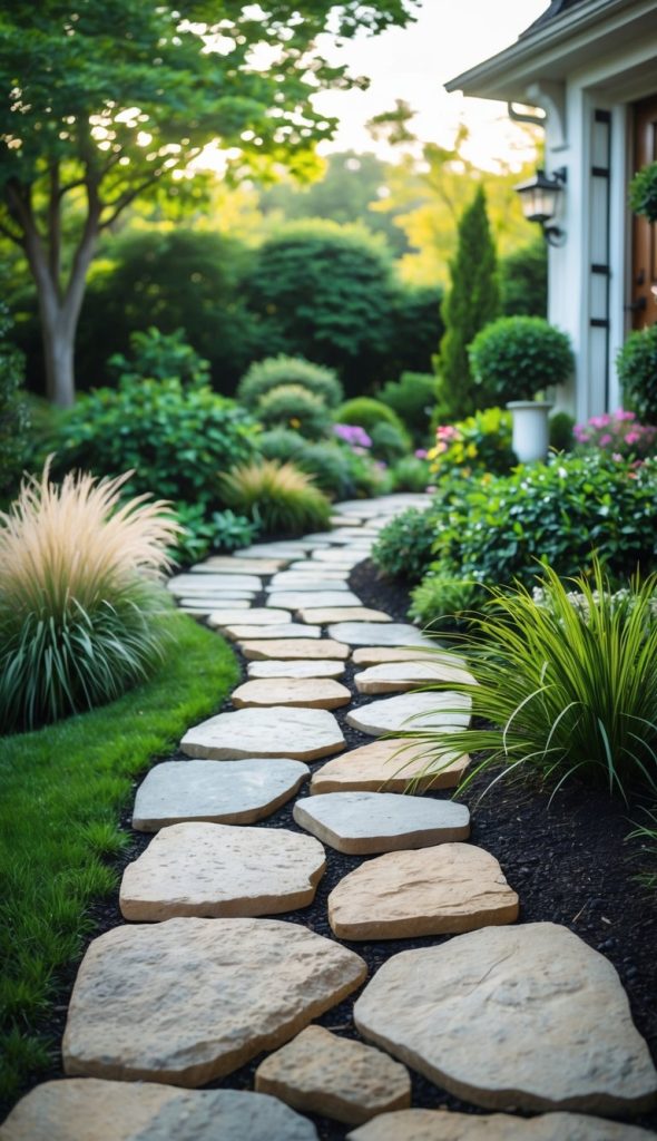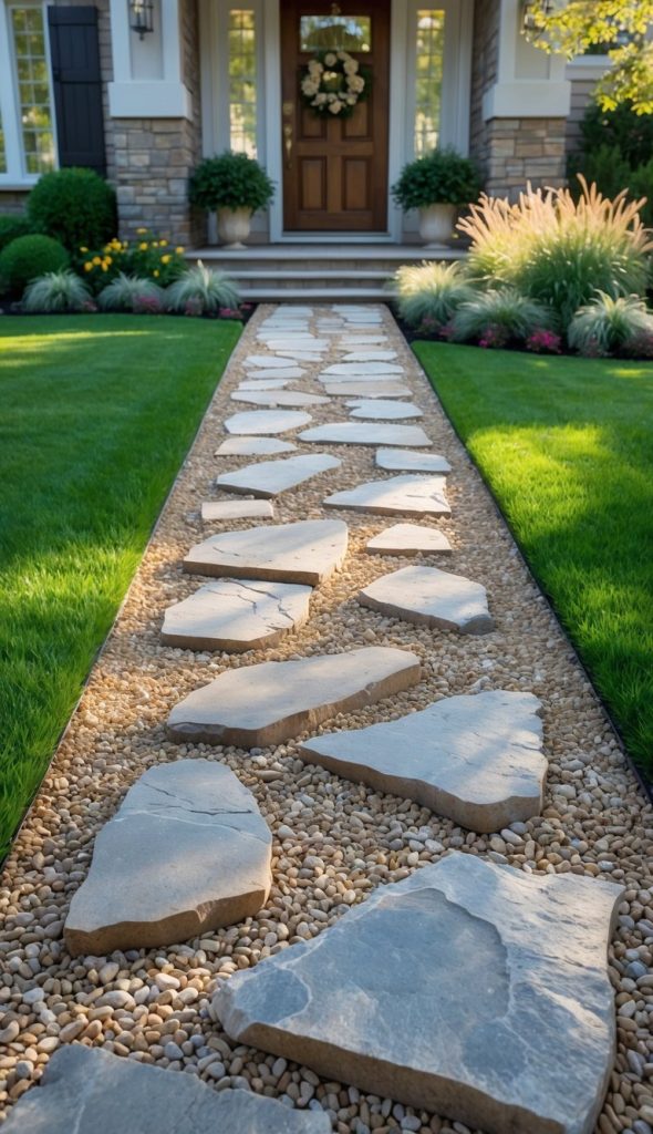 This setup works well if you like a simple, classic style. The contrast between the stone and greenery makes the path stand out without being flashy.