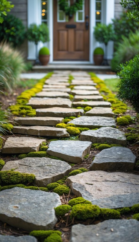 Using rustic flagstone slabs with moss growing between creates a cozy, natural look. The moss softens the hard edges of the stone and adds a splash of green. This style fits well with garden paths that feel calm and welcoming.