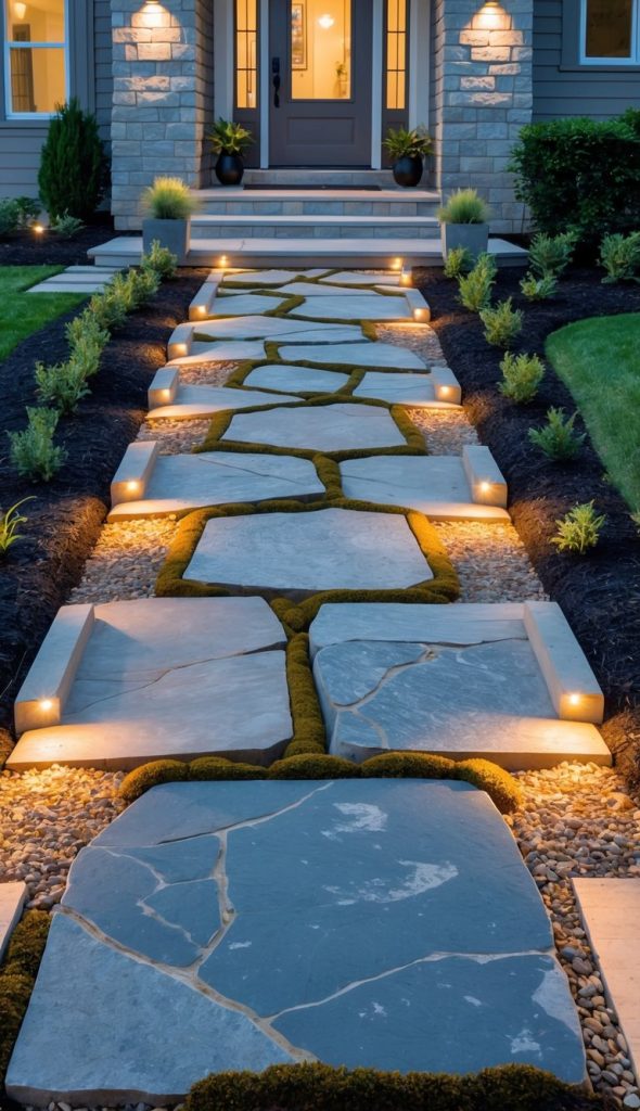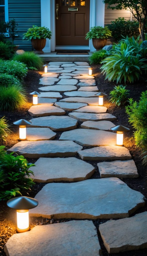 Adding low garden lighting along your flagstone path helps guide your way and adds soft charm. It makes your front entrance feel safe and inviting, especially at night.