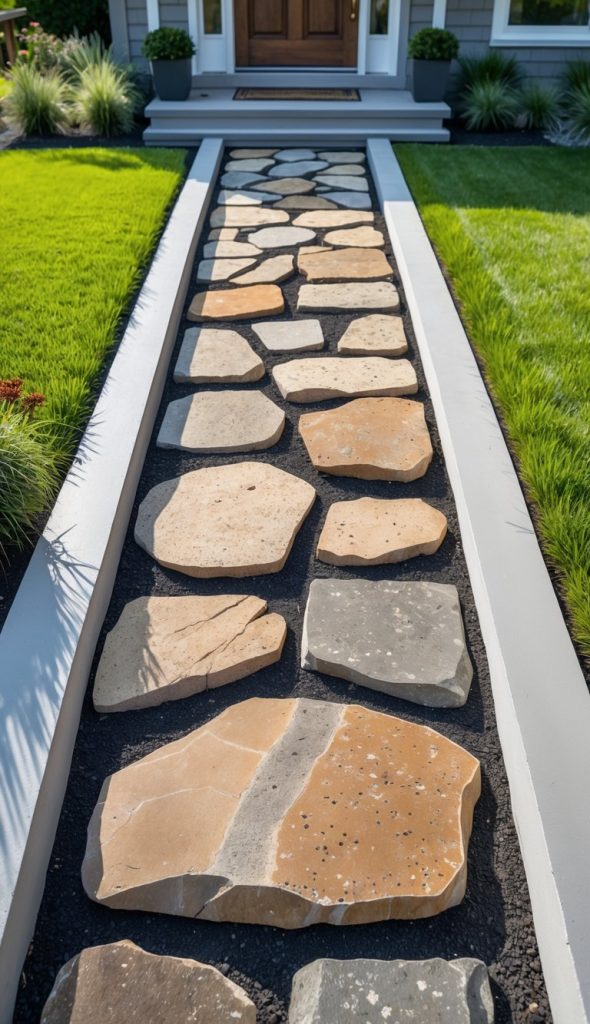 Combining flagstone with concrete borders makes your pathway stand out with clean, sharp edges. The concrete keeps stones in place and adds a neat, modern touch.