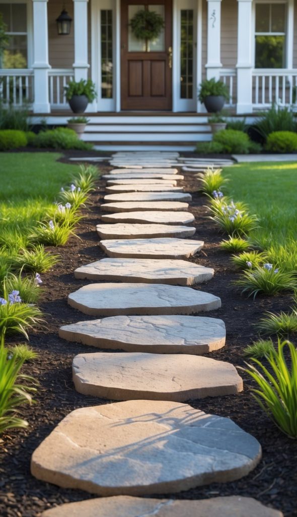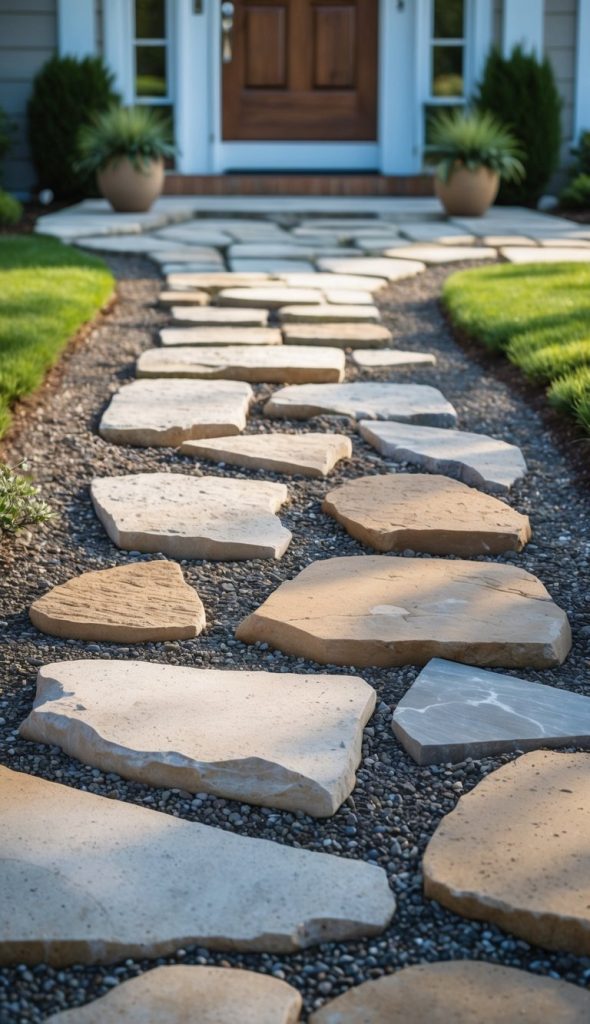 You can fit stones tightly or leave small spaces for plants or gravel. This approach works well for creating a casual, welcoming path to your front door.