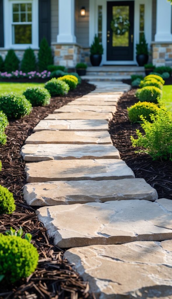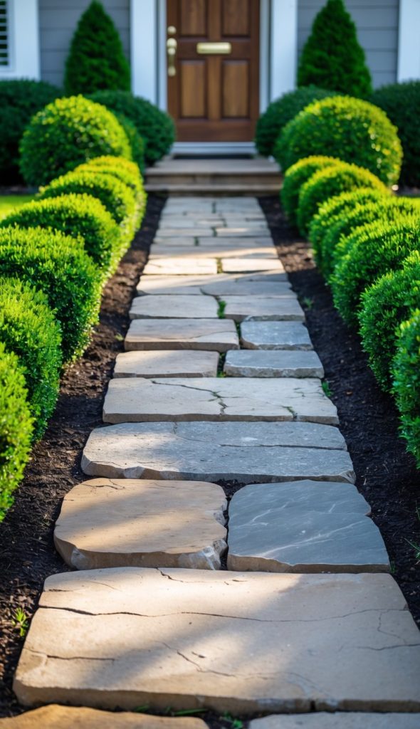 A flagstone path bordered by neatly trimmed bushes creates a clean, inviting look. The green bushes add a natural frame, guiding visitors to your front door.
