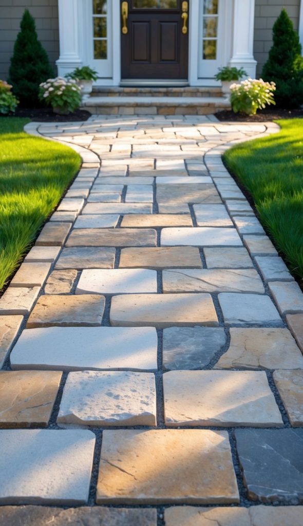 A curved flagstone path gives a natural, relaxed feeling to your front walkway. Instead of a straight line, the stones gently wind through your garden or yard. This design works well whether your space is big or small.