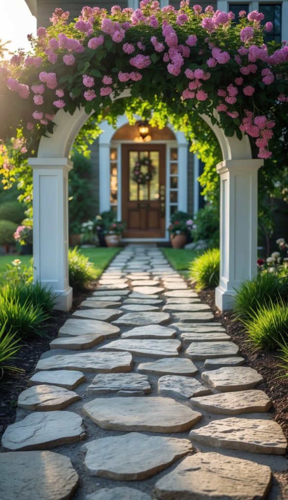 A flagstone path under a blooming archway gives your front entrance a warm, inviting feel. The stones create a natural look that blends with the flowers and greenery above.