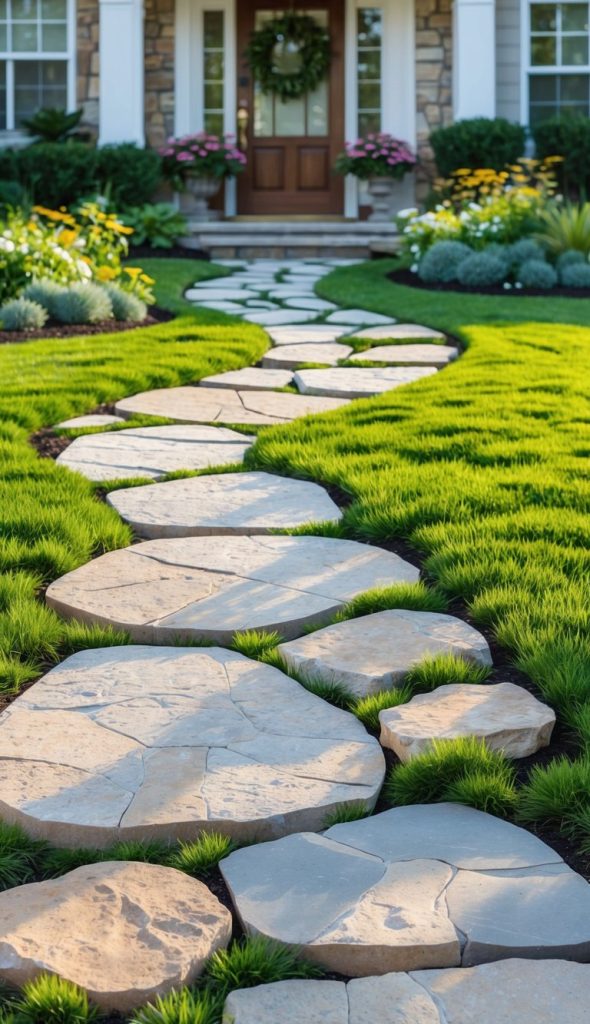 Using large flagstone slabs spaced evenly creates a simple and clean look. It lets grass or ground cover grow between the stones, adding a natural feel. This design works well for modern or minimalist front yards.