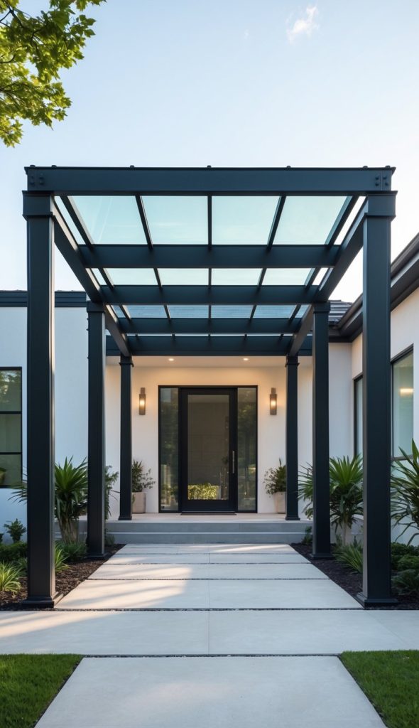A modern steel pergola with a glass roof gives your front entrance a sleek, clean look. The glass lets in natural light while protecting you from rain. This way, your porch stays bright and dry, no matter the weather. Steel also adds strength and lasts a long time with little care.