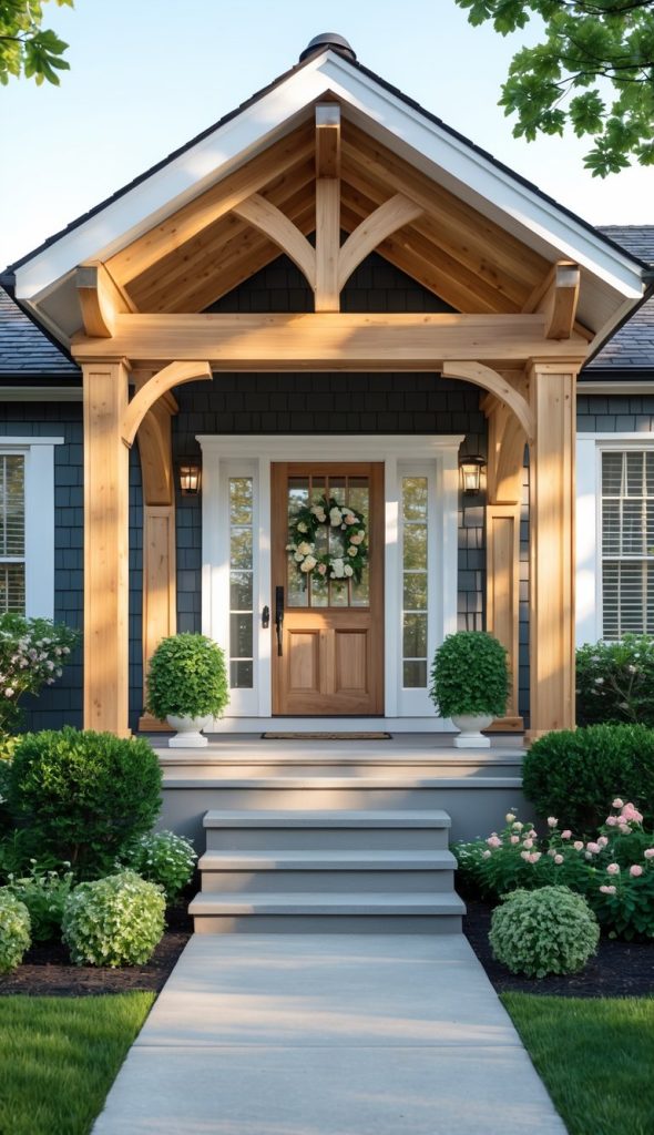 You can add charm to your front entrance with a wooden pergola. The natural wood gives warmth and a cozy feel.