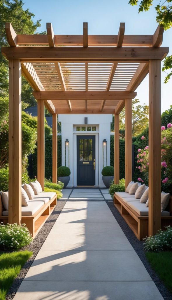 You can add built-in bench seating to your pergola for a cozy spot to sit and relax. This design saves space and makes your front entrance more inviting. It works well even on smaller porches by combining shade and seating in one structure.
