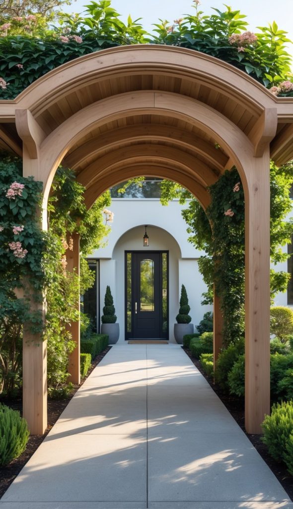 You can add a soft, welcoming look with an arched entrance pergola. Its curved shape stands out from straight lines and gives your entrance a gentle feel. This design works well with many home styles and creates a nice frame for your front door.