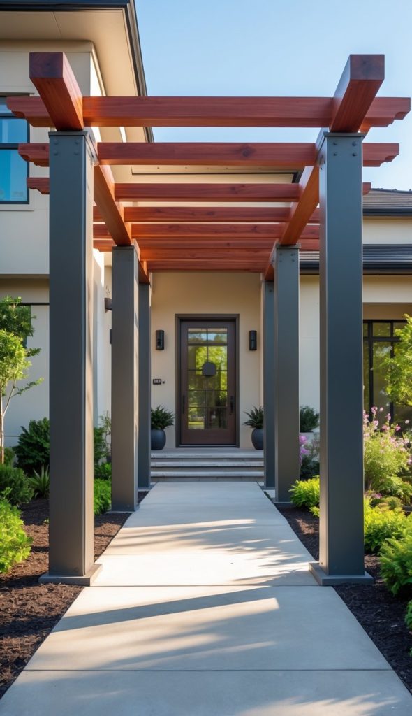 You can create a sturdy pergola using square steel posts combined with redwood beams. This mix gives your entrance a modern and natural look. The steel adds strength, while the redwood offers warmth and durability.