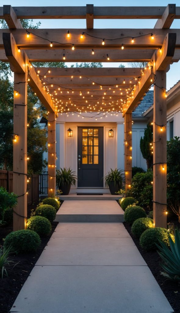 You can make your front entrance warm and inviting by adding string lights to your pergola. The soft glow creates a cozy atmosphere for evening gatherings or quiet nights. It’s a simple way to add charm and personality to your porch.