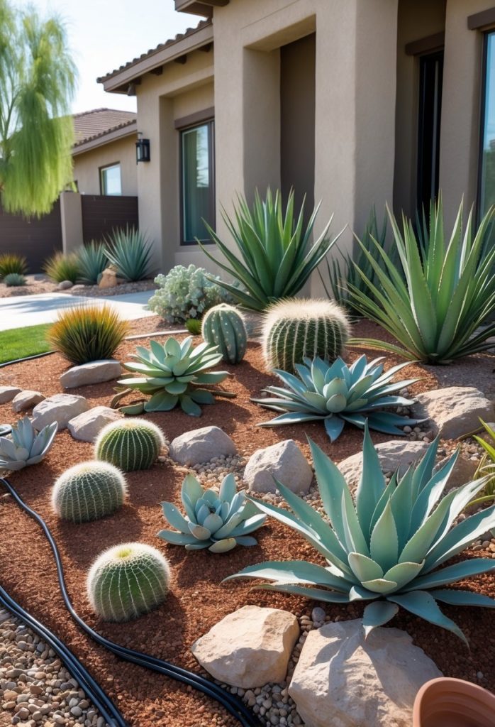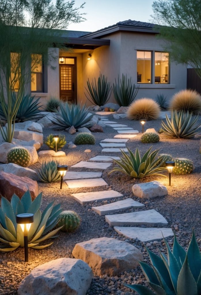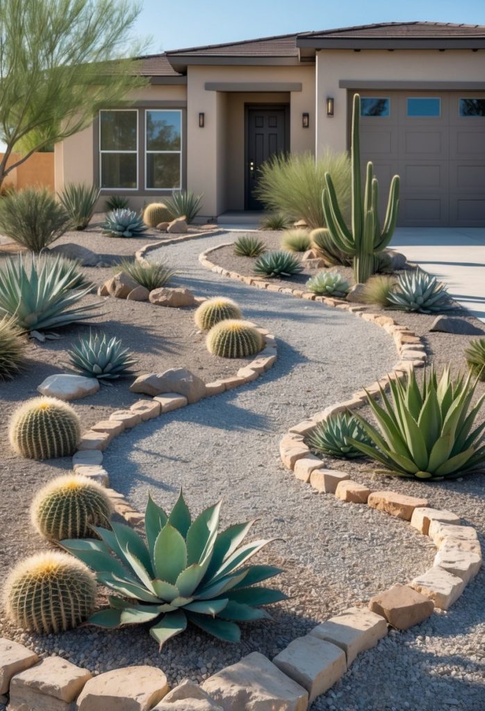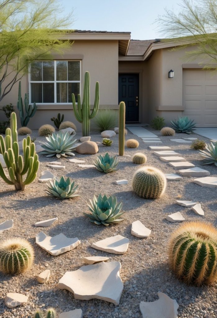 Add hardy plants like succulents or small cacti for texture and color. This garden style saves water and needs little care, making it perfect for your front yard.