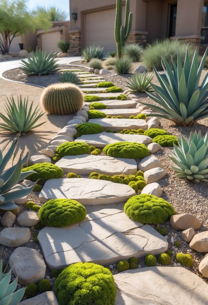 You can add desert moss or low-growing groundcovers between stones to soften the look of your front yard. These plants fill in spaces and add a splash of green without needing much water.