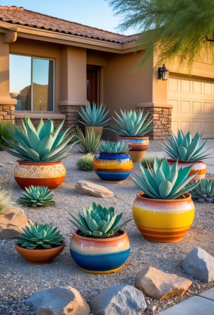 You can add charm to your front yard by using colorful ceramic pots. They brighten up any space and bring a fresh look without much effort.