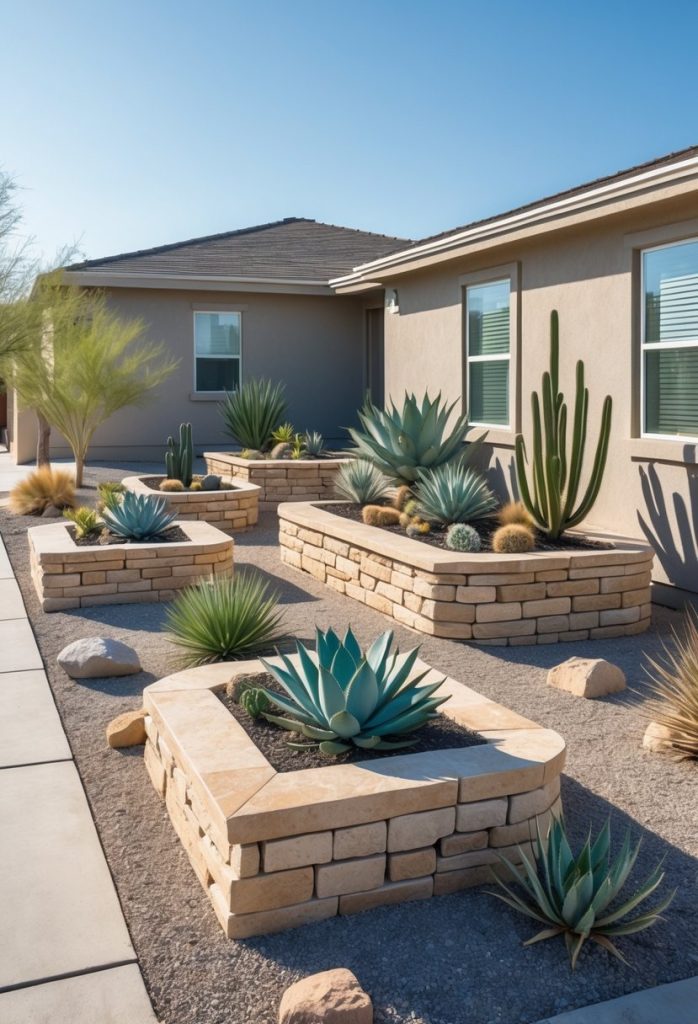 Using stones for these planters fits the desert look and keeps your garden low-maintenance. Plus, raised beds help protect your plants from pests and make gardening more comfortable for you.