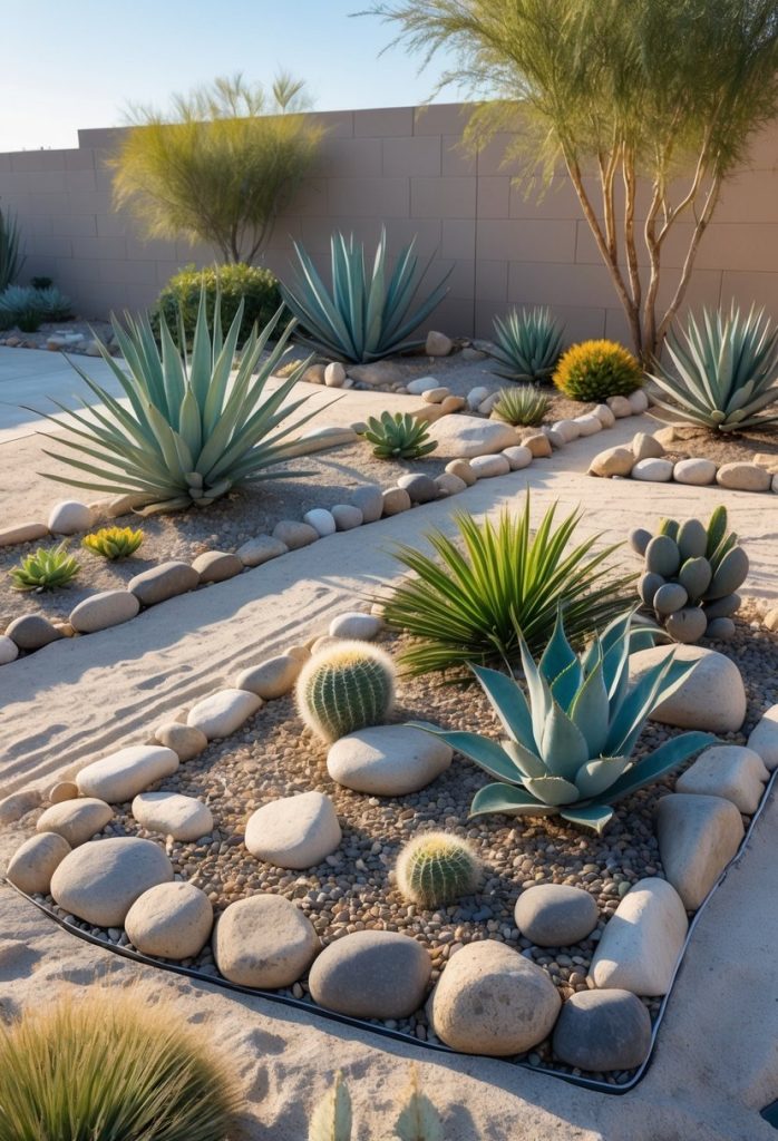 Boulders work well with desert plants and gravel. They need little maintenance and can make your yard look organized and interesting. Plus, they last a long time and fit a desert look perfectly.