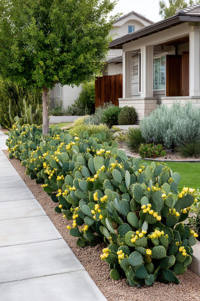 You can use prickly pear cactus to create a unique hedge or border in your front yard. These cacti grow well in sunny, dry spots with well-drained soil.