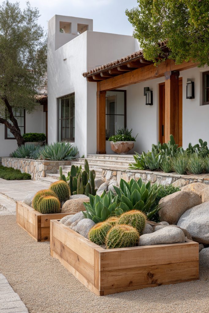 These beds also warm the soil and protect plants from pets or foot traffic. Use well-draining soil and space the cacti about 2-3 feet apart for best growth. Raised beds add structure and make your front yard look neat and organized.