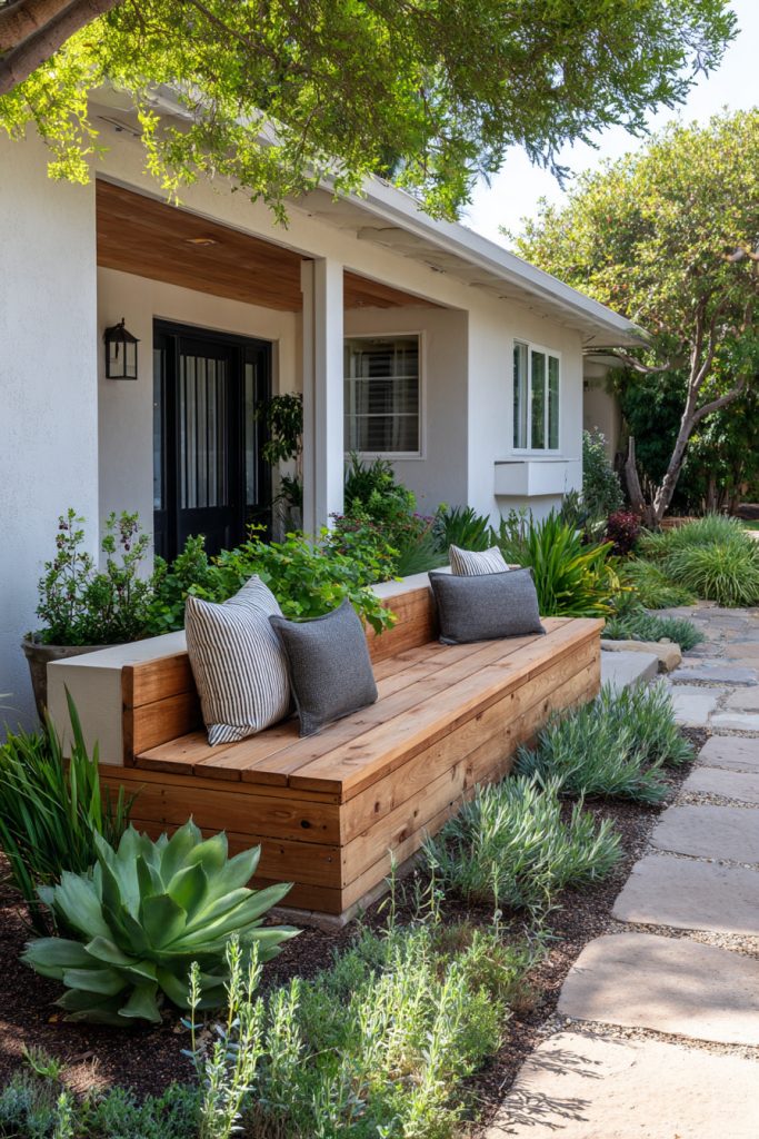 You can create a comfortable spot in your xeriscaped front yard by adding seating made from weather-resistant wood. Cedar and teak are great choices because they handle sun and rain well.