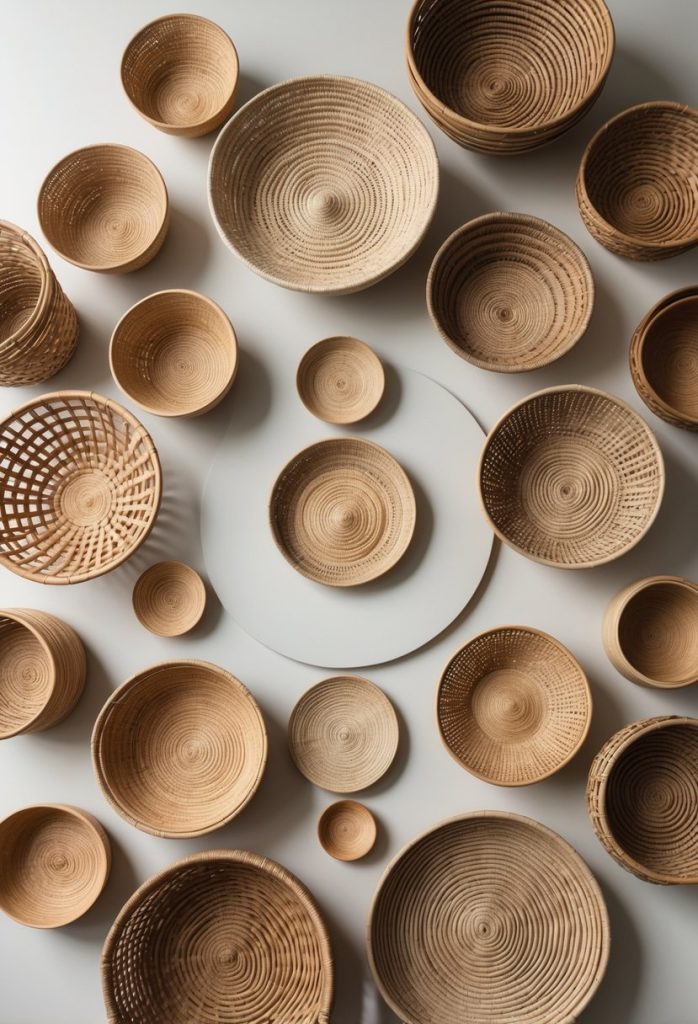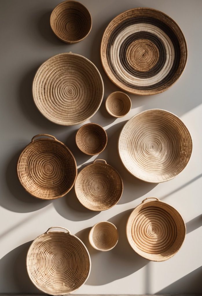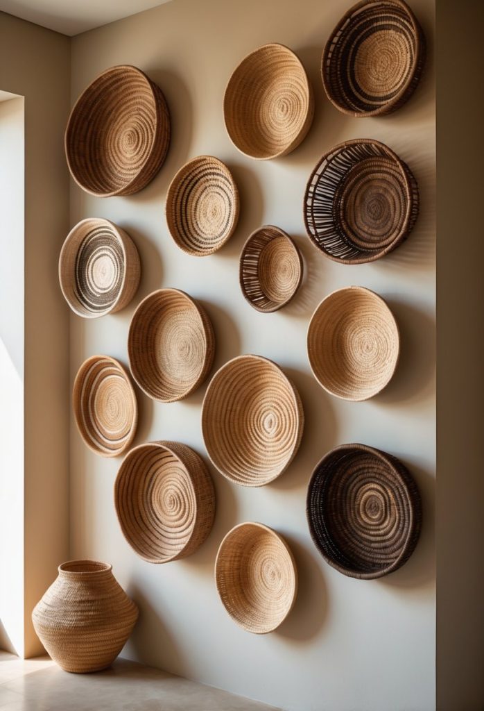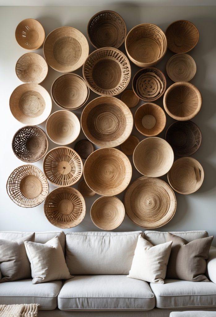 You can use handwoven baskets to make a simple circle on your wall. This shape feels fresh and modern.