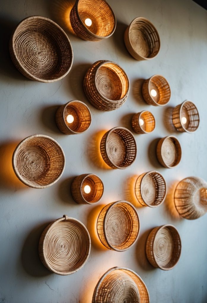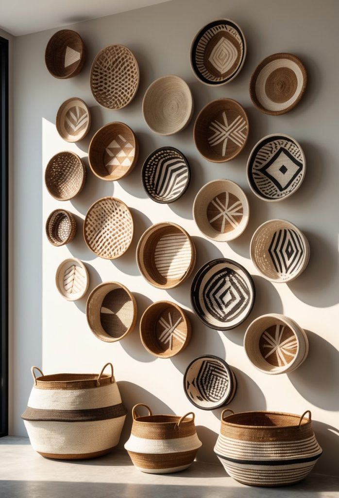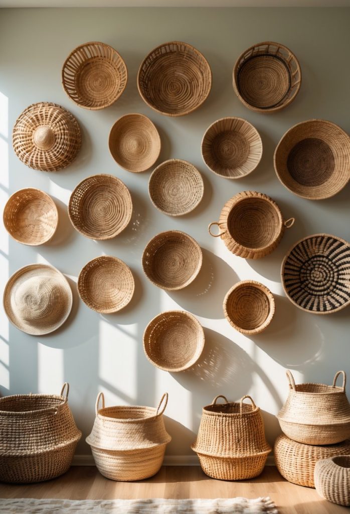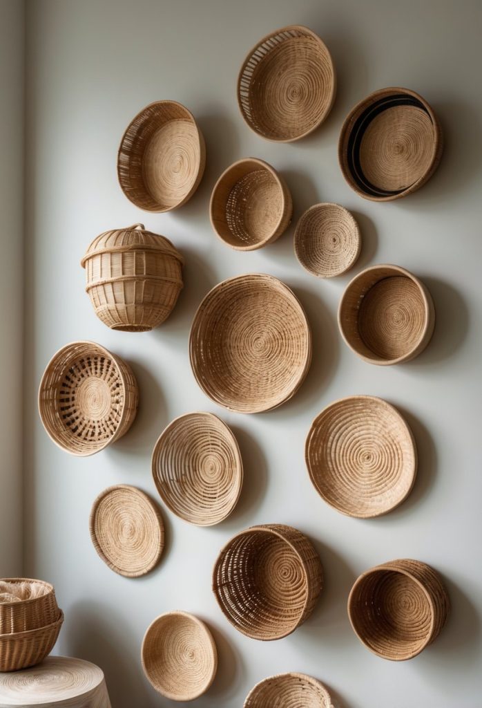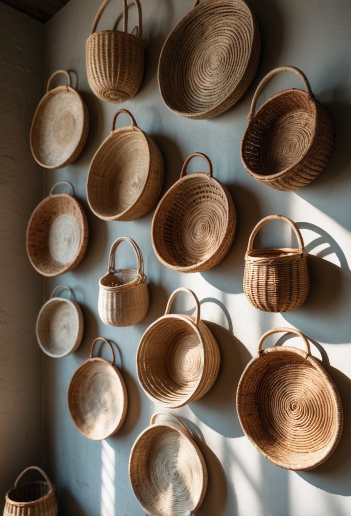 Try arranging different basket sizes and shapes for a textured, cozy feel. This style adds character without needing heavy wall art. It’s an easy way to brighten up plain walls with natural materials.