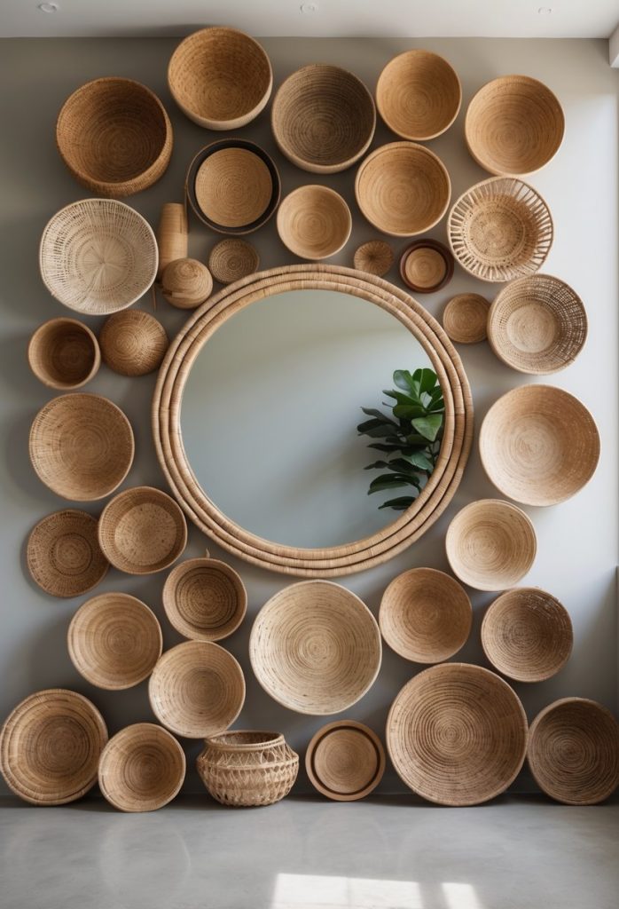 You can create a charming look by arranging handwoven baskets around your mirror. This adds texture and a natural feel to your wall.
