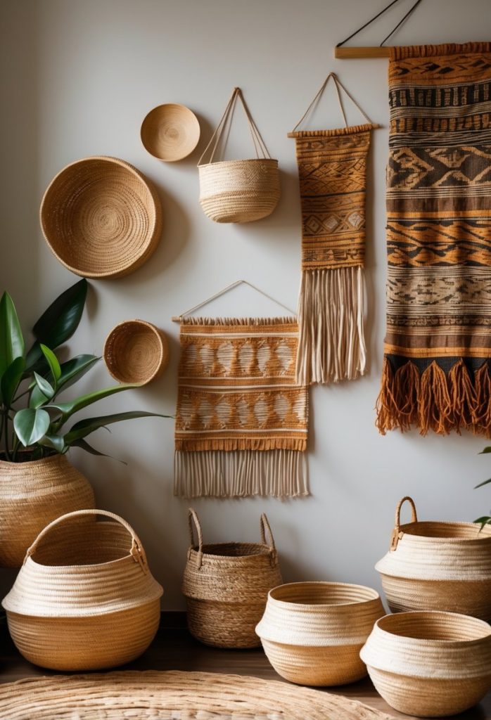 You can mix handwoven baskets with textile wall hangings to create a warm, textured look. The soft fabrics balance the natural fibers of the baskets.