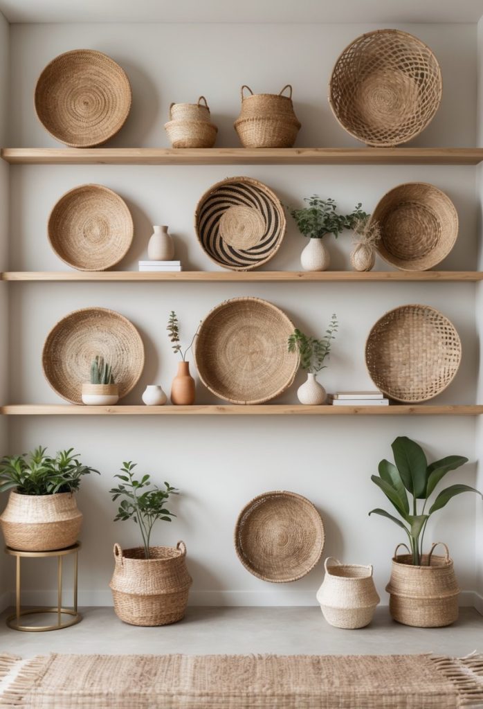 You can create a nice look by placing handwoven baskets on floating shelves. Mix them with small plants, candles, or books to add variety.