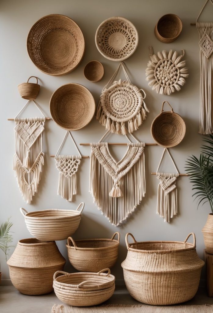 You can mix your handwoven baskets with macrame hangings to create a nice boho look. The different textures of baskets and knotted cords add interest to your walls.