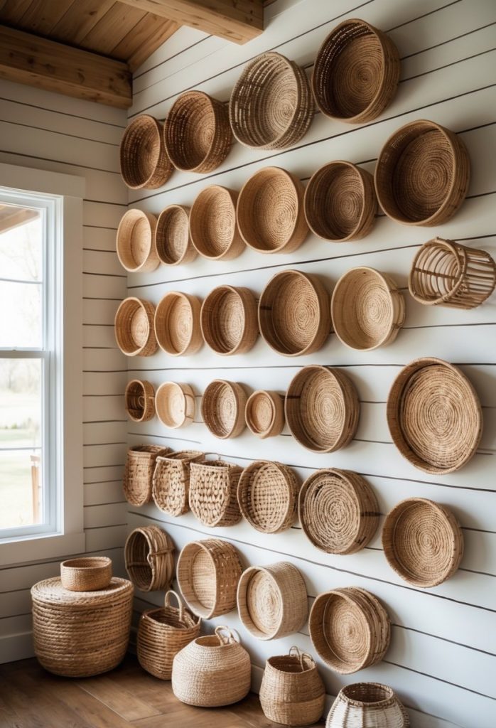 You can create a warm farmhouse look by layering handwoven baskets on a shiplap wall. The simple lines of shiplap give a nice background that makes the baskets stand out.