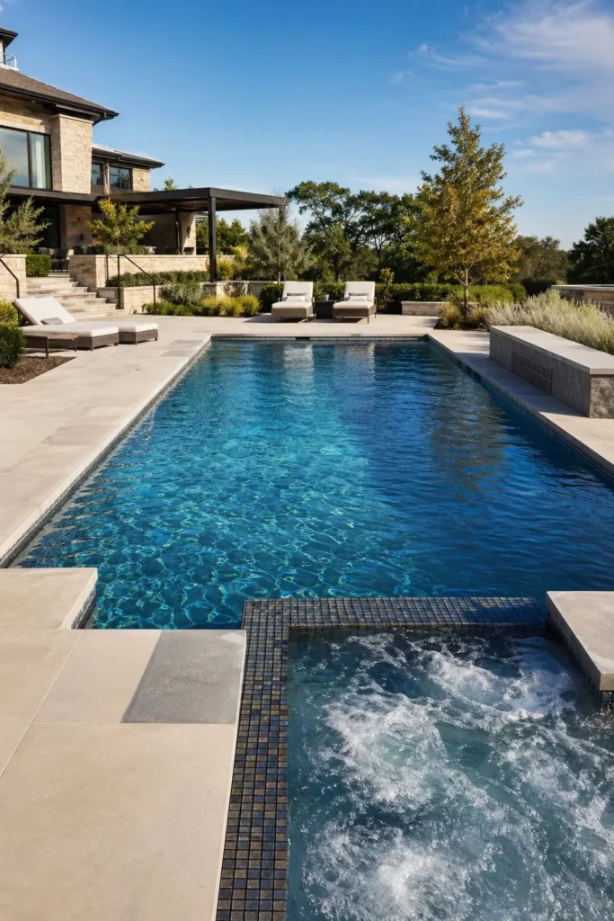 A rectangular pool with spa gives your backyard a clean, luxury look with year-round appeal. The straight edges pair well with modern homes, large-format pavers, and linear waterline tile. An attached raised spa adds warmth, symmetry, and a polished resort feel.