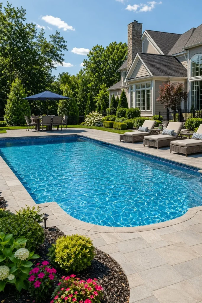 A medium-size pool gives you room to swim, float, and entertain without taking over the whole yard. Rectangular or softened geometric shapes work well in many suburban homes. Add a tanning ledge, broad entry steps, and a paved lounge area for balance.