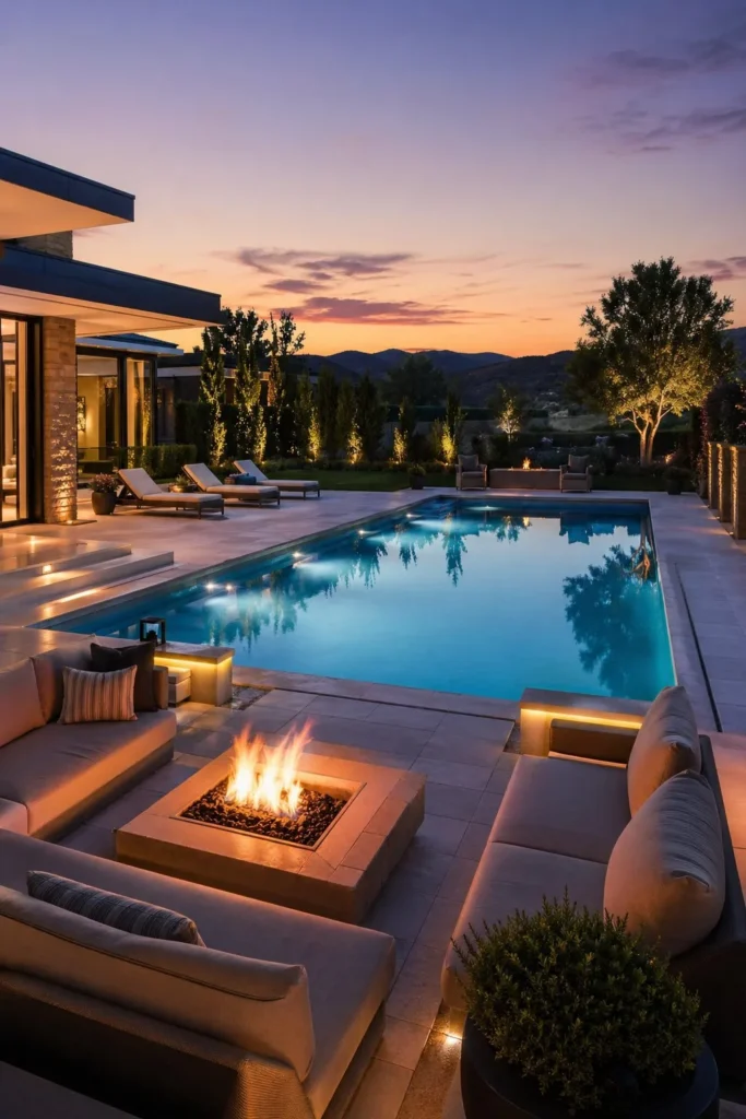 Pairing water with fire gives your backyard a strong focal point day and night. A sunken fire pit lounge, modern seating, and smooth hardscaping create a layered outdoor living space. This is a strong fit for a contemporary pool design with entertaining in mind.