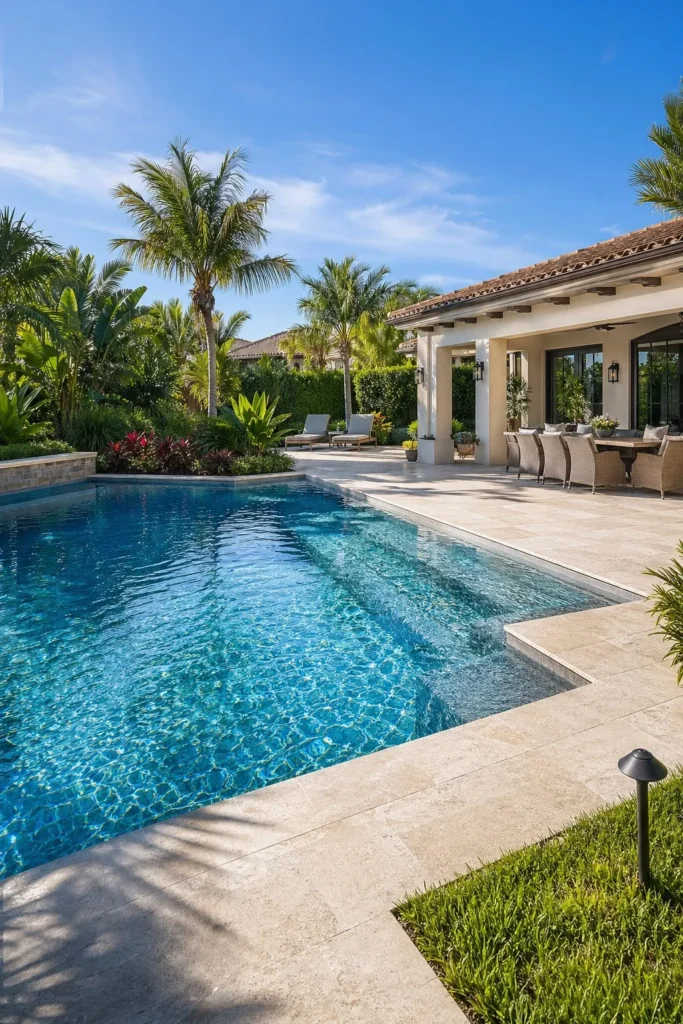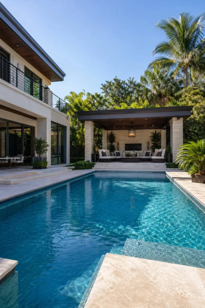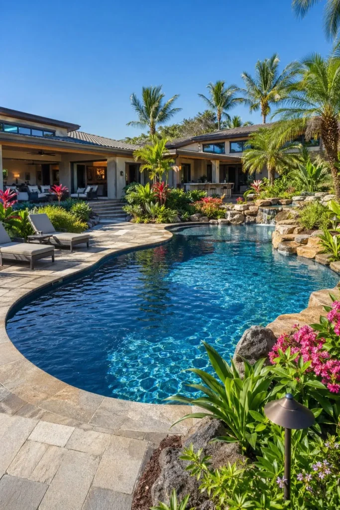 Curved freeform pool designs soften the yard and blend well with layered planting. Use ornamental grasses, flowering shrubs, and palms to make the edge feel rich and private. This look is ideal if you want the water to feel tucked into the garden.