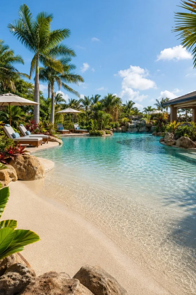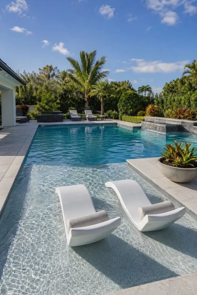 A beach entry replaces steps with a smooth, sloped walk-in edge. It gives your pool a resort look and adds a relaxed place for shallow soaking. Surround it with palms, chaises, and textured stone for a true vacation-style setting.