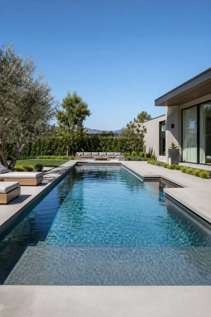A minimalist pool keeps the focus on shape, proportion, and finish. Clean geometric lines, pale concrete, and subtle coping create a refined contemporary pool design that feels calm and architectural. Keep furniture low-profile to match the simple layout.
