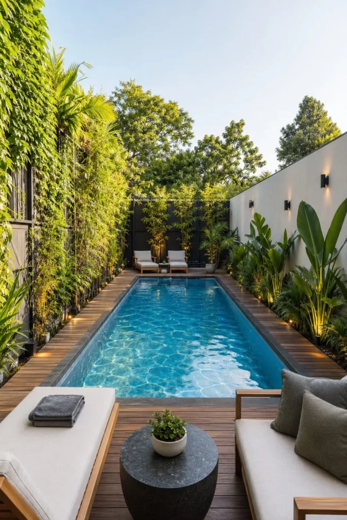 Small in ground pools can still feel luxurious when the layout is sharp and efficient. A narrow lap-style pool, slim decking, and built-in bench seating make the most of limited space. Glass fencing and light finishes help the yard feel open.