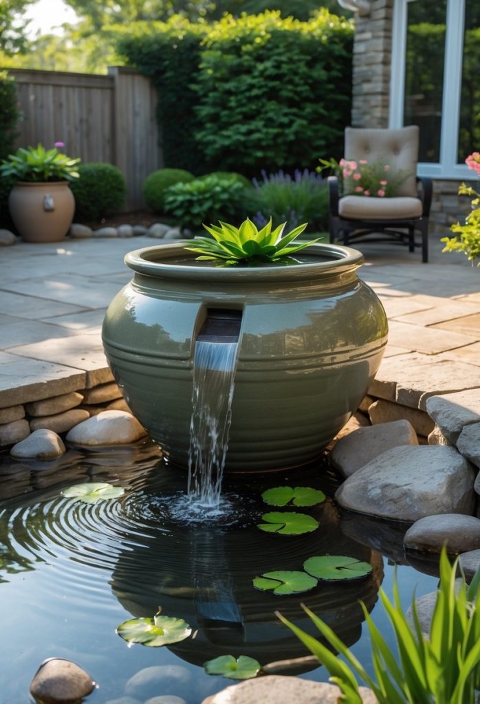 You can create a small, peaceful pond right on your patio using a large ceramic pot. Just fill the pot with water and add a few aquatic plants like water lilies or floating greenery.