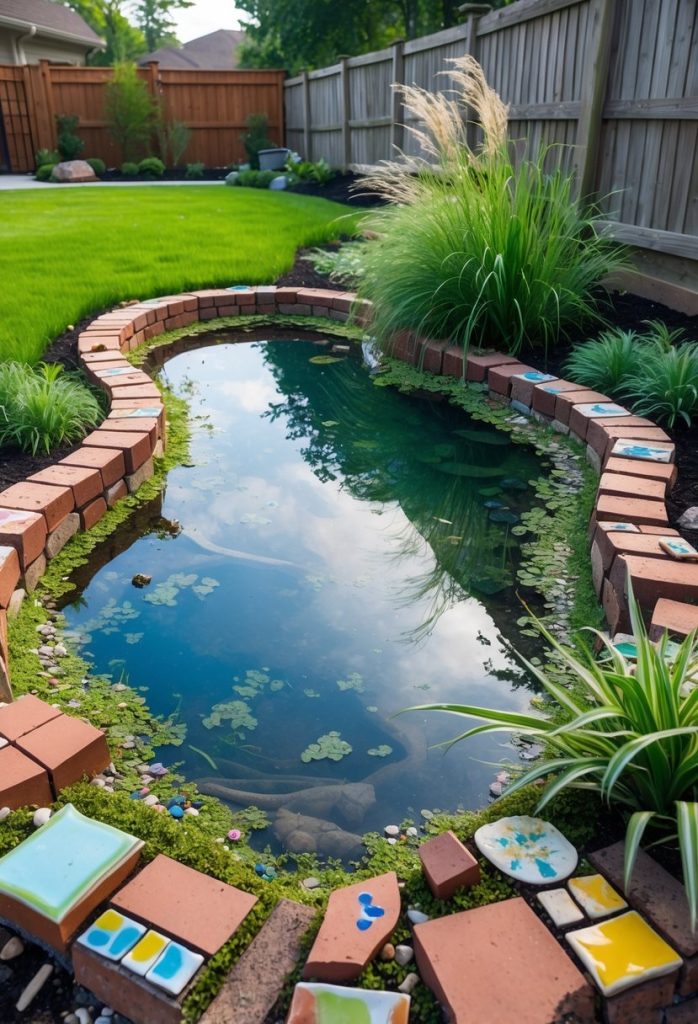 You can create a rustic pond by using broken tiles and old bricks as the border. These materials add a natural, charming look to your garden.